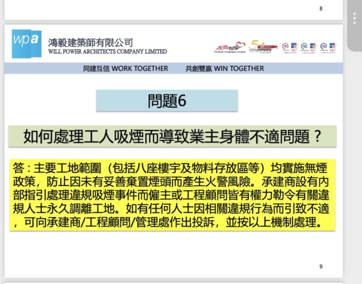 宏福苑一名业主介绍,他们曾多次发现施工工人在竹棚架内吸烟,并反馈至维修方。在宏福苑一次工程发布会上,宏业建设公司曾回应如何处理工人吸烟而导致业主身体不适问题。公司答复称,主要工地范围(包括八座楼宇及物料存放区等)均实施无烟政策,防止因未有妥善弃置烟头而产生火警风险。承建商设有内部指引处理违规吸烟事件,而雇主或工程顾问皆有权力勒令有关违规人士永久调离工地。如有任何人士因相关违规行为而引致不适可向承建商、工程顾问、管理处作出投诉。