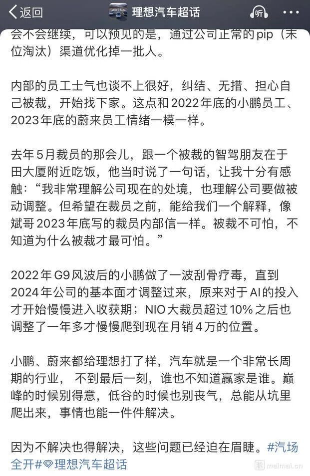 理想重新回归“创始人节奏”。一位员工感慨:“不学华为了,想哥回来了。”