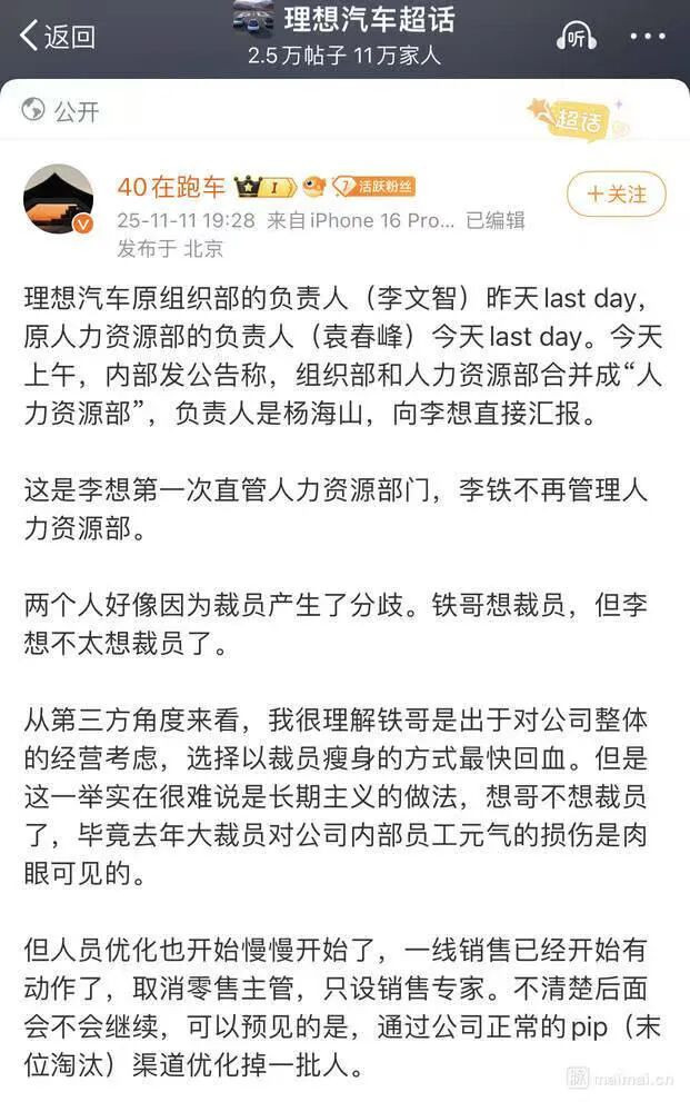 2025年11月11日这天,理想汽车内部发布了一份低调却意味深长的组织调整公告。