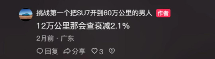 电池耐用的还不止这一例。另一个车主开着SU7跑了7万公里,穿越沙漠雪山,电池衰减才3%。看来小米官方吹的14层电池防护,倒也不是纯忽悠。配合8年16万公里的质保,长期用下来,电费可能比油费省出一台新手机。